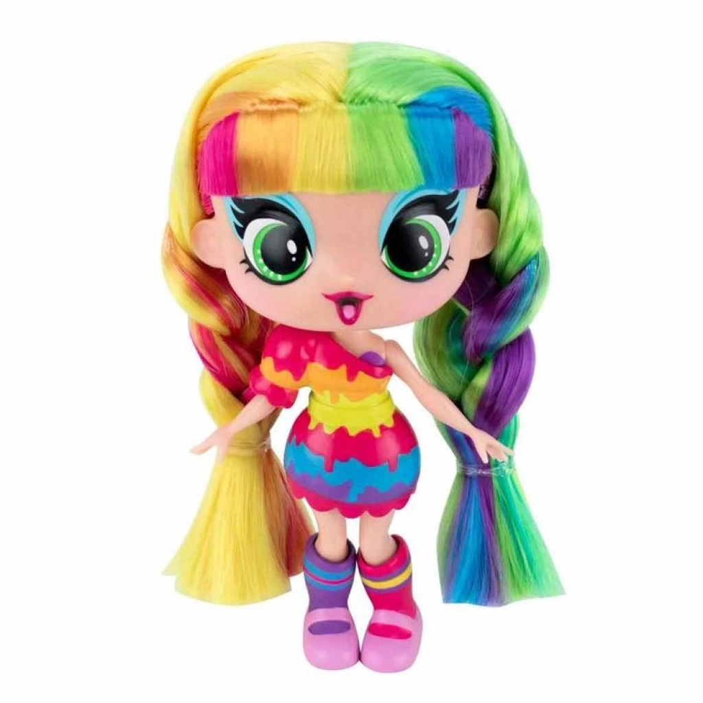 Decora bebeği gökkuşağı renginde yumuşacık saçları ve tek omuzlu şık elbisesi ile göz kamaştırıyor!