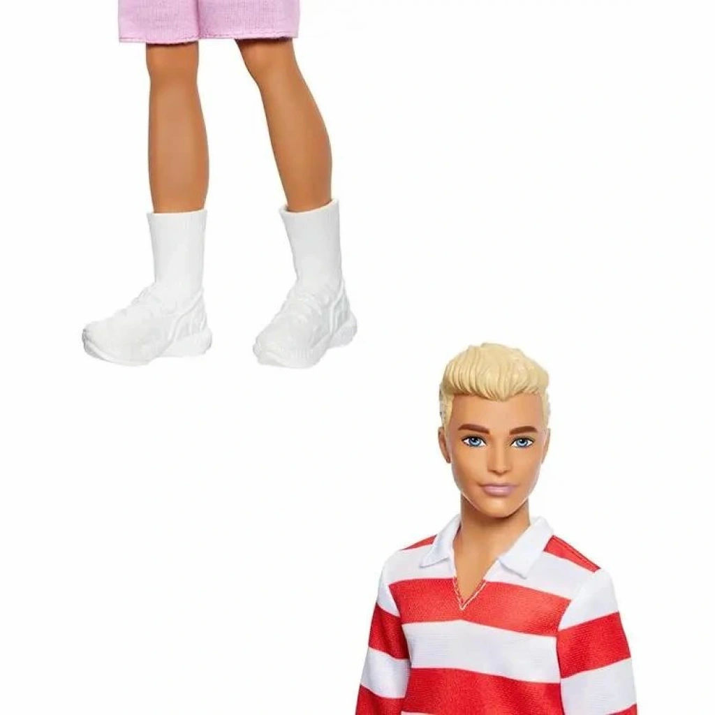 Sarışın Saçlı Barbie Fashionistas Ken Bebek, Pembe Şort, Beyaz Çorap ve Spor Ayakkabı ile Kırmızı Beyaz Çizgili Polo Tişört Giyiyor.