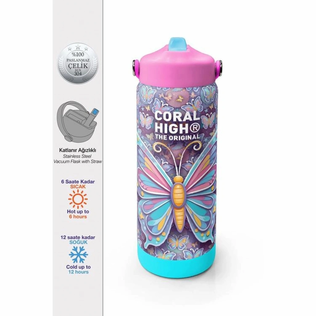 CORAL HIGH 38306 KIDS PASTEL RENKLİ KELEBEK DESENLİ KATLANIR AĞIZLI PİPETLİ ÇELİK TERMOS 650ML