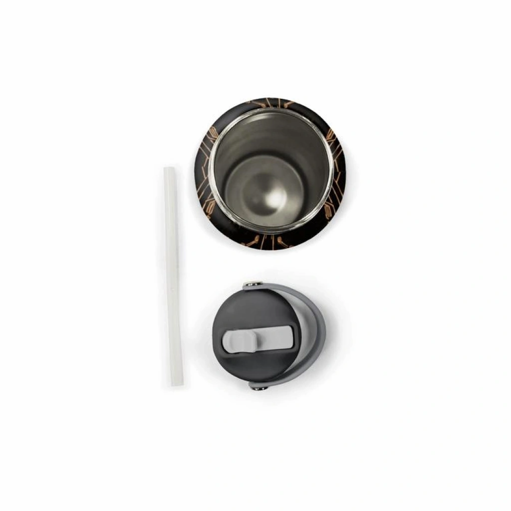 Çelik termosun kapağında (genellikle soğuk içeceklerde kullanılması tavsiye edilir) pipetli içim özelliği sağlayan ergonomik ve sağlam bir ağızlık bulunmaktadır.