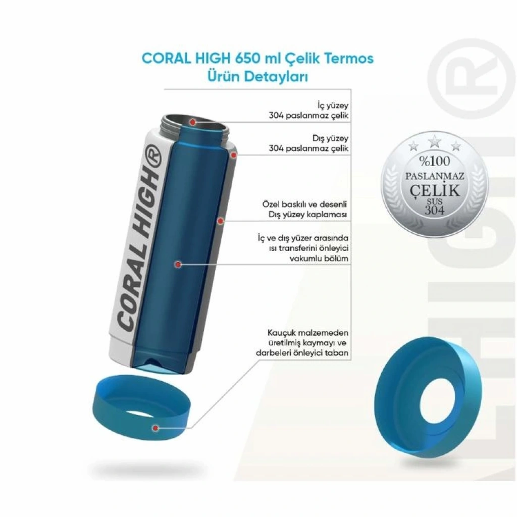 Coral High Çelik Termos tüm iç ve dış yüzeyinin 304 paslanmaz çelikten ve vakumlu hava ile korunan ara yüzeyi sayesinde içerideki ısının dışarı ile bağlantısını olabilecek en üst düzeyde korumaktadır.