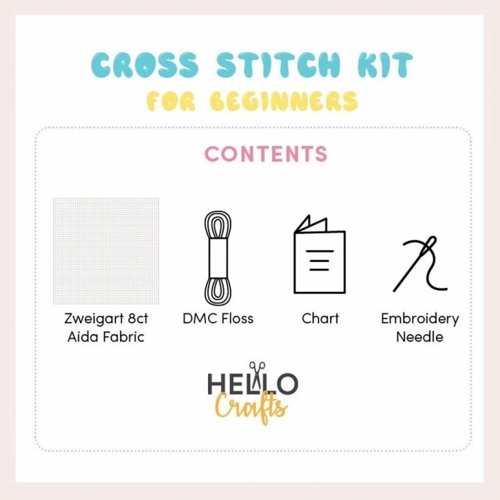 Her set, Zweigart 8ct Aida kumaş, DMC iplik, renk şeması ve nakış iğnesi içerir.