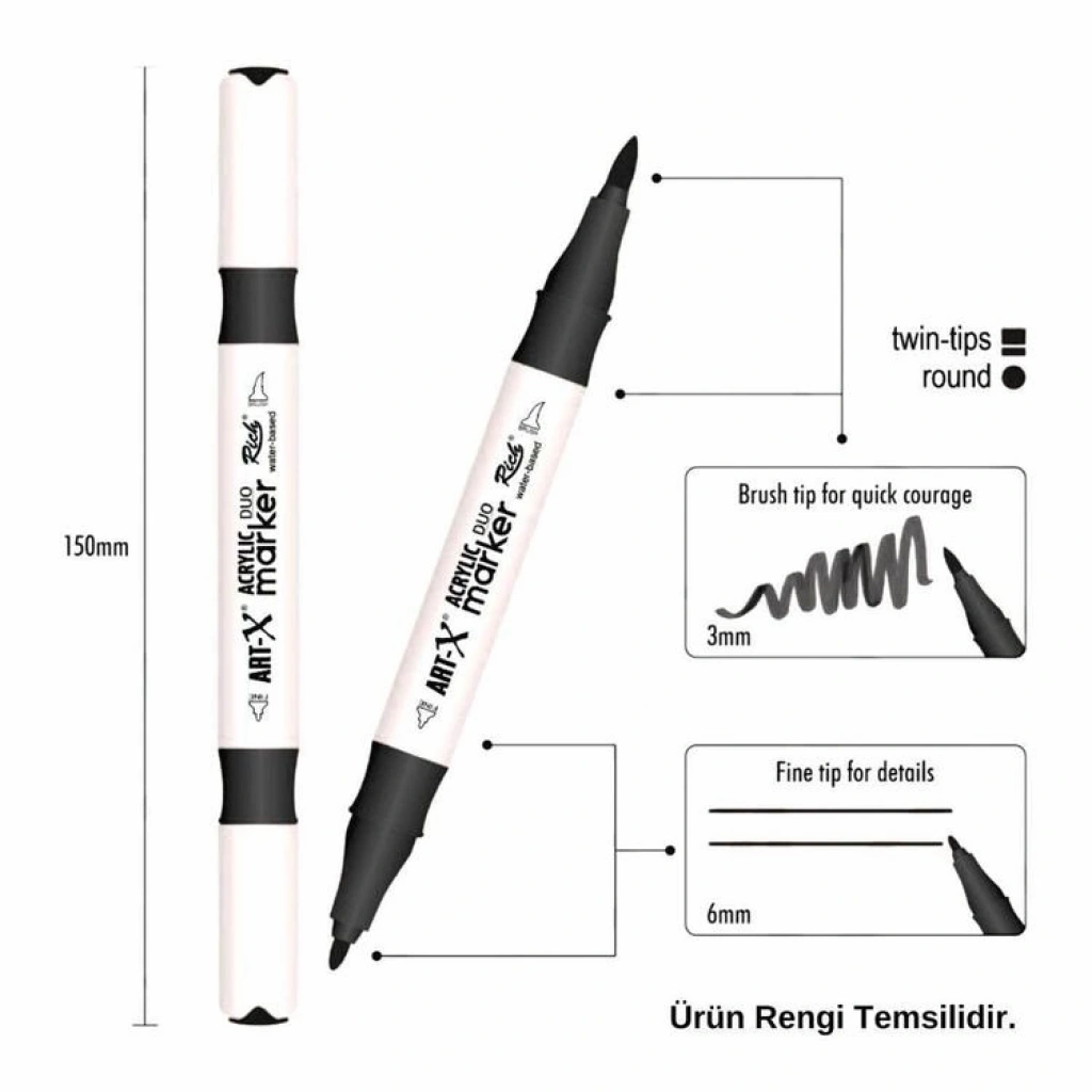 Çift uçlu; 3 mm / 6mm fırçalar, ince ve kalın çizgiler yazmanıza izin verir, mükemmel çok yönlülük ve esneklik sağlar,