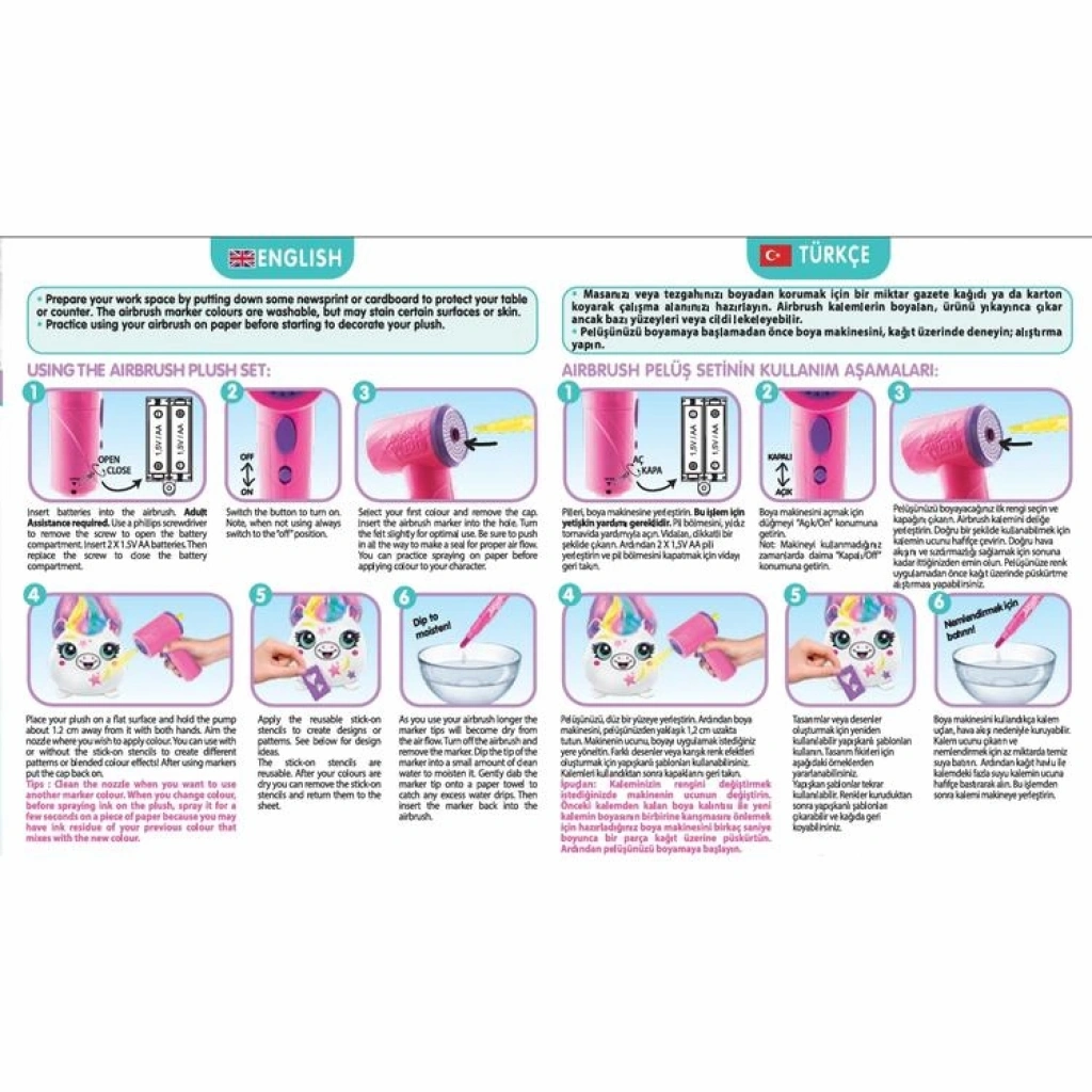 1 peluş, airbrush, kalemler, şablonlar ve aksesuarlar içerir.