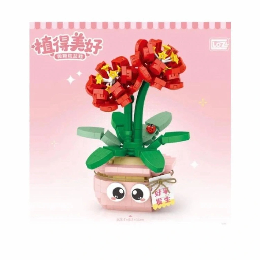 Bu LOZ Mikro Blok seti, mikro bloklardan yapılmış kırmızı çiçekler ve yeşil yapraklardan oluşan bir saksıdan oluşuyor.